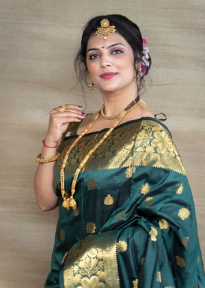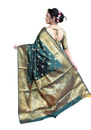 Introducing our exquisite Black & Gold Banarasi Silk Saree, a timeless symbol of elegance and tradition. |