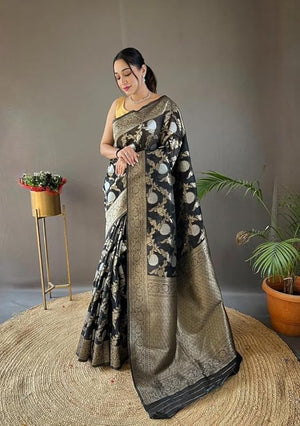 Introducing our exquisite Black & Gold Banarasi Silk Saree, a timeless symbol of elegance and tradition. |