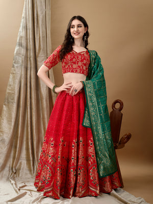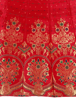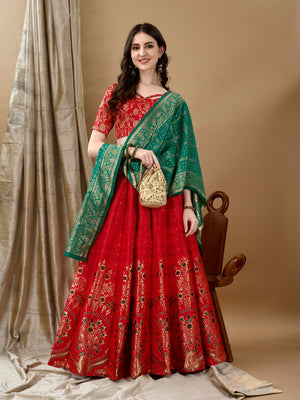 | Item :- | Kishoree Red Banarasi Lehenga with Mustard Zari Dupatta |