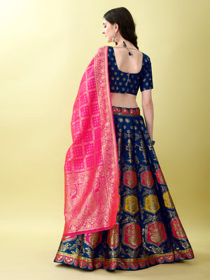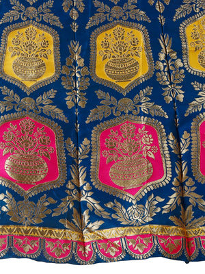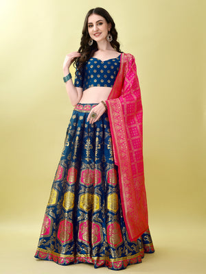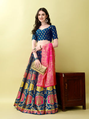 1️⃣ LEHANGA Premium-quality Banarasi silk lehenga Royal midnight Blue with intricate floral border Mustard Pink dupatta with woven zari motifs Designer sleeveless blouse with a V-cut neckline Semi-stitched lehenga for a perfect fit Eye-catching mandala & buta patterns on skirt Perfect for weddings, receptions, and sangeet nights Lightweight yet grand in appearance Comfortable inner lining for longer wear Traditional colors with a modern twist Experience a touch of royalty with this Midnight Green Banarasi Lehenga Choli from Kishoree’s exclusive Heritage Collection. Woven with exceptional craftsmanship, the lehenga showcases an intricate pattern of floral and circular motifs in vibrant orange, turquoise, and gold hues that pop against the deep blue base. Crafted from luxurious Banarasi silk, the lehenga is a perfect blend of tradition and grandeur. The wide, detailed border and high flare ensure a graceful look in every step and twirl. The designer blouse features a trendy V-cut neckline and dotted embellishments, giving a modern finish to this ethnic outfit. Adding richness to the ensemble is the mustard yellow dupatta, elegantly adorned with zari work and traditional motifs. The warm golden tones beautifully complement the deep blue lehenga, making it ideal for both day and evening events. Whether it's for Navratri, sangeet, wedding ceremonies, or festive parties, this set promises to make you stand out. Pair it with gold-toned jewelry, jhumkas, and embroidered juttis for the perfect royal Indian look. The lehenga is semi-stitched, offering flexibility in customization, and lined for comfort, allowing you to wear it for long hours without discomfort. Bring home the timeless beauty of Indian craftsmanship with this Kishoree masterpiece. |